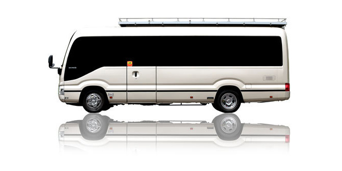 マイクロバスは室内で100v電源が使えたり、衣装ハンガーを掛けるためのバーや、メイク台が有ります。室内灯も作業がしやすい様に明るい照明が付いています。カーテンも厚手の遮光タイプを使用にています、着替えの為の仕切りカーテンも有ります。外から車内が見えない様にウインドウフィルムも濃い物を使用しています。